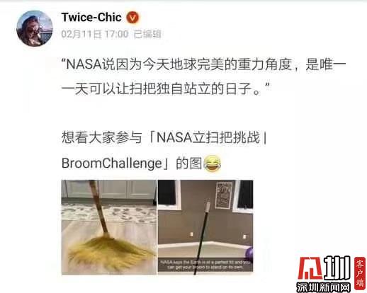見圳客戶端·深圳新聞網2020年2月11日訊 (見圳客戶端、深圳新聞網記者 吳英敏)2月11日,有網友在微博曬出兩張掃把直立的照片:“宅在家里試了一下NASA立掃把挑戰(zhàn),據說一年中只有今天可以立起來,親測有效!”記者也在朋友圈發(fā)現許多朋友紛紛曬出掃把直立成功的圖片,有網友稱,“宅家立掃把”將全國人民心相連了!隨后,人民日報微博辟謠稱,真相是,掃帚能立起來與今天的引力無關,每天都可以立,只要你能找到平衡!