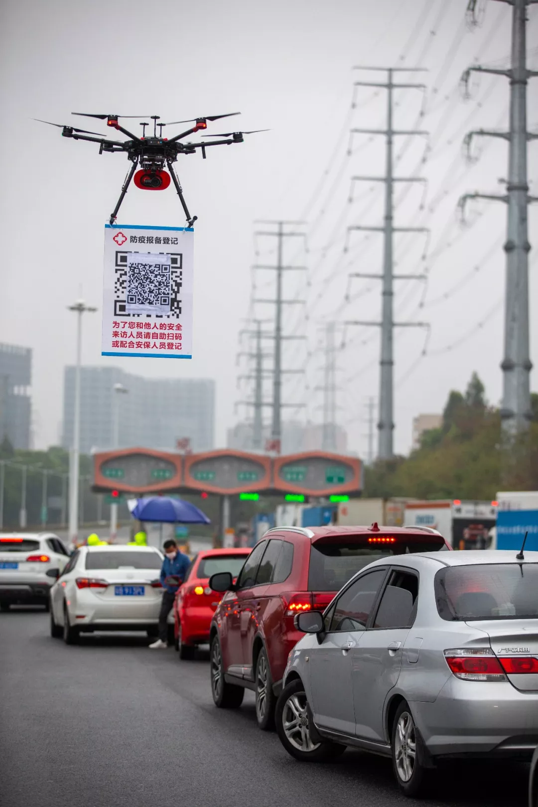 2月11日,在G94高速深圳觀瀾收費(fèi)處,深圳龍華機(jī)訓(xùn)大隊(duì)無人機(jī)飛行隊(duì)的民警操作懸掛有申報二維碼的無人機(jī)在候檢的車輛間飛行。