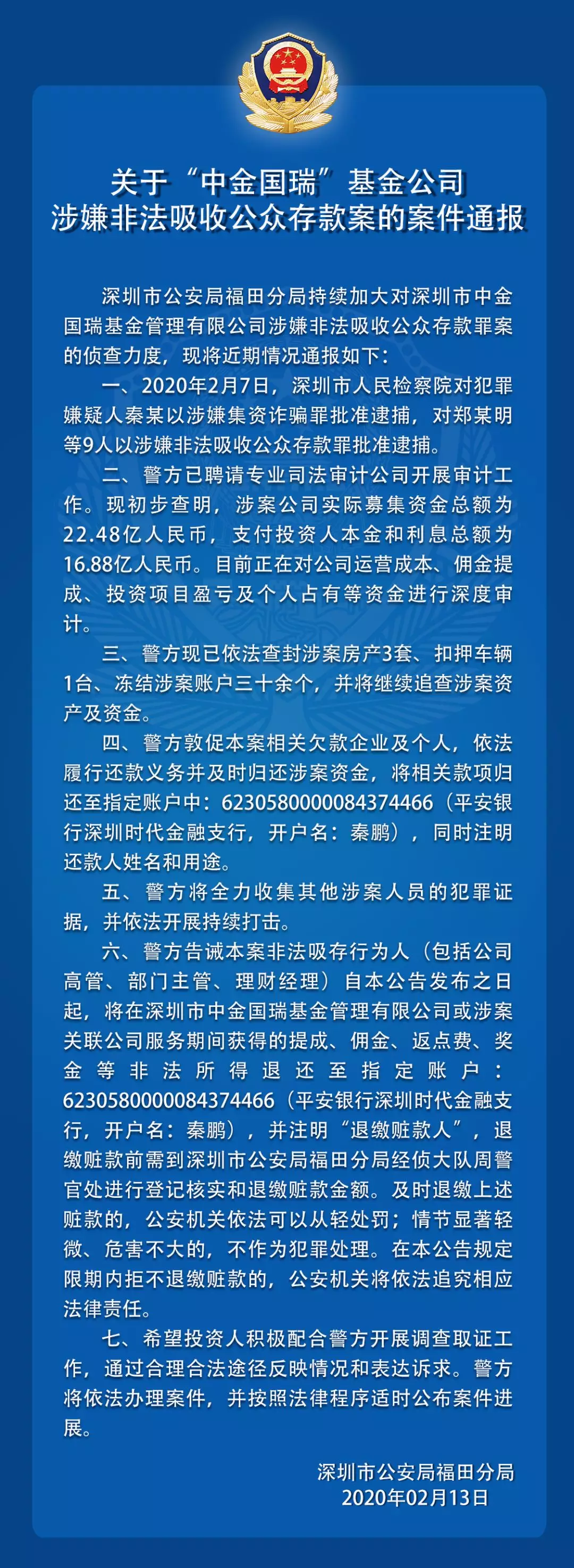 關(guān)于“中金國瑞”基金公司涉嫌非法吸收公眾存款案的案件通報