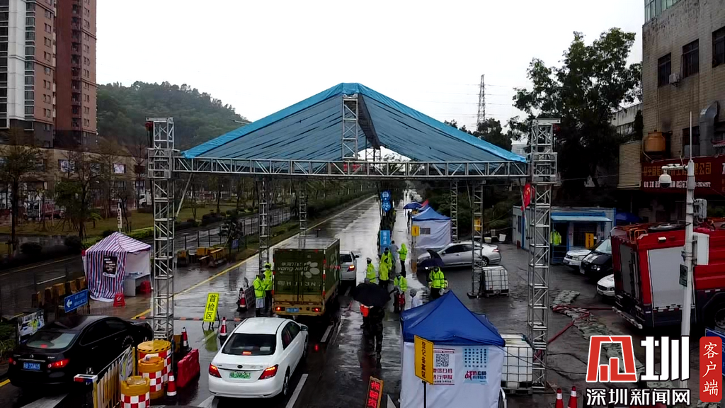 根據天氣降雨預警,布吉街道經科辦和后勤連夜奮戰(zhàn),在鳳凰祥新西卡點搭建起長20米、寬10米、高5米的臨時雨棚,保障一線奮戰(zhàn)干部職工以及過往市民開窗檢測的方便。