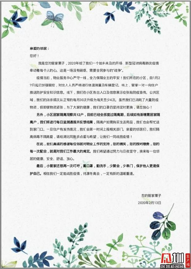 網(wǎng)友文婷婷向深圳新聞網(wǎng)記者透露,近日,位于龍華區(qū)的萊蒙水榭春天,有不少業(yè)主提出要給一線物業(yè)人員發(fā)放物資補貼,得到不少業(yè)主的認可和支持。