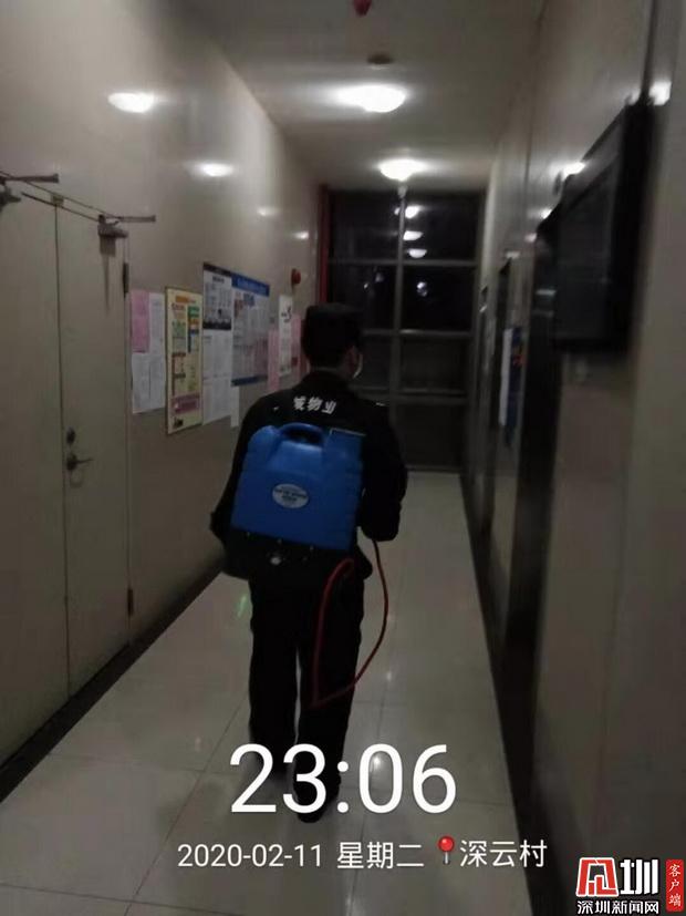 深云村物業(yè)員工對小區(qū)進行消毒