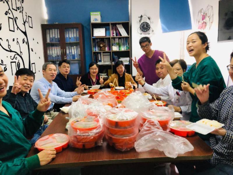 20:40,院領(lǐng)導(dǎo)和專家剛剛討論會診結(jié)束,病房同事也剛剛完成輪換交接。配餐室突然多了好多人,大家好像約好的似的,都不愿意回去自己過年。我們相聚一起,不分上下級,我們只是一群同事(其實(shí),劉映霞副院長也在)一起吃除夕工作餐,一起過大年。