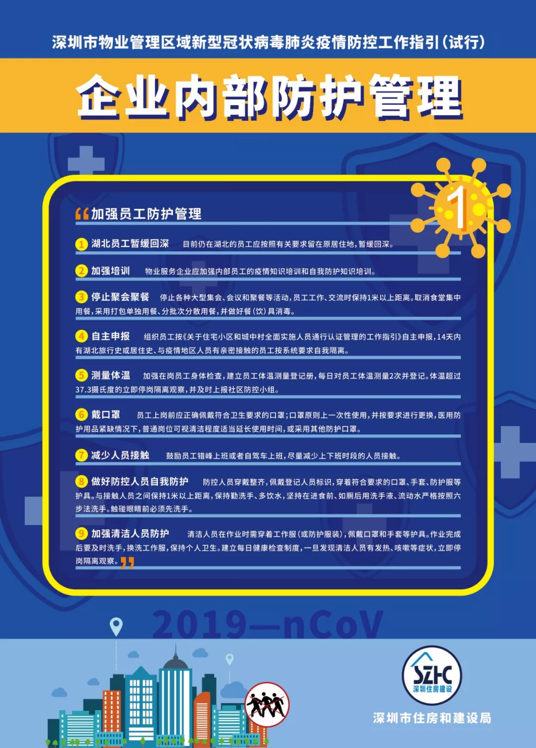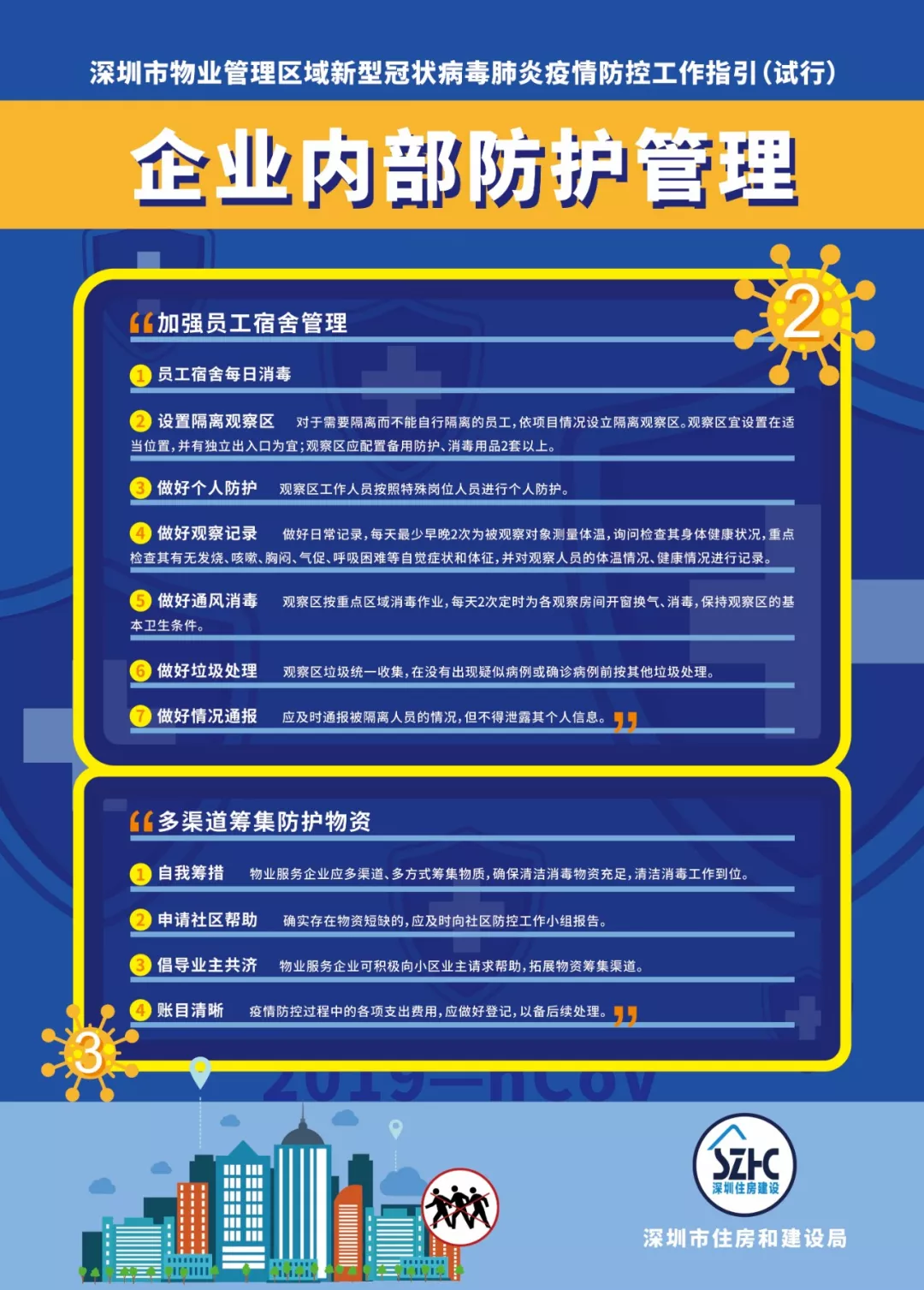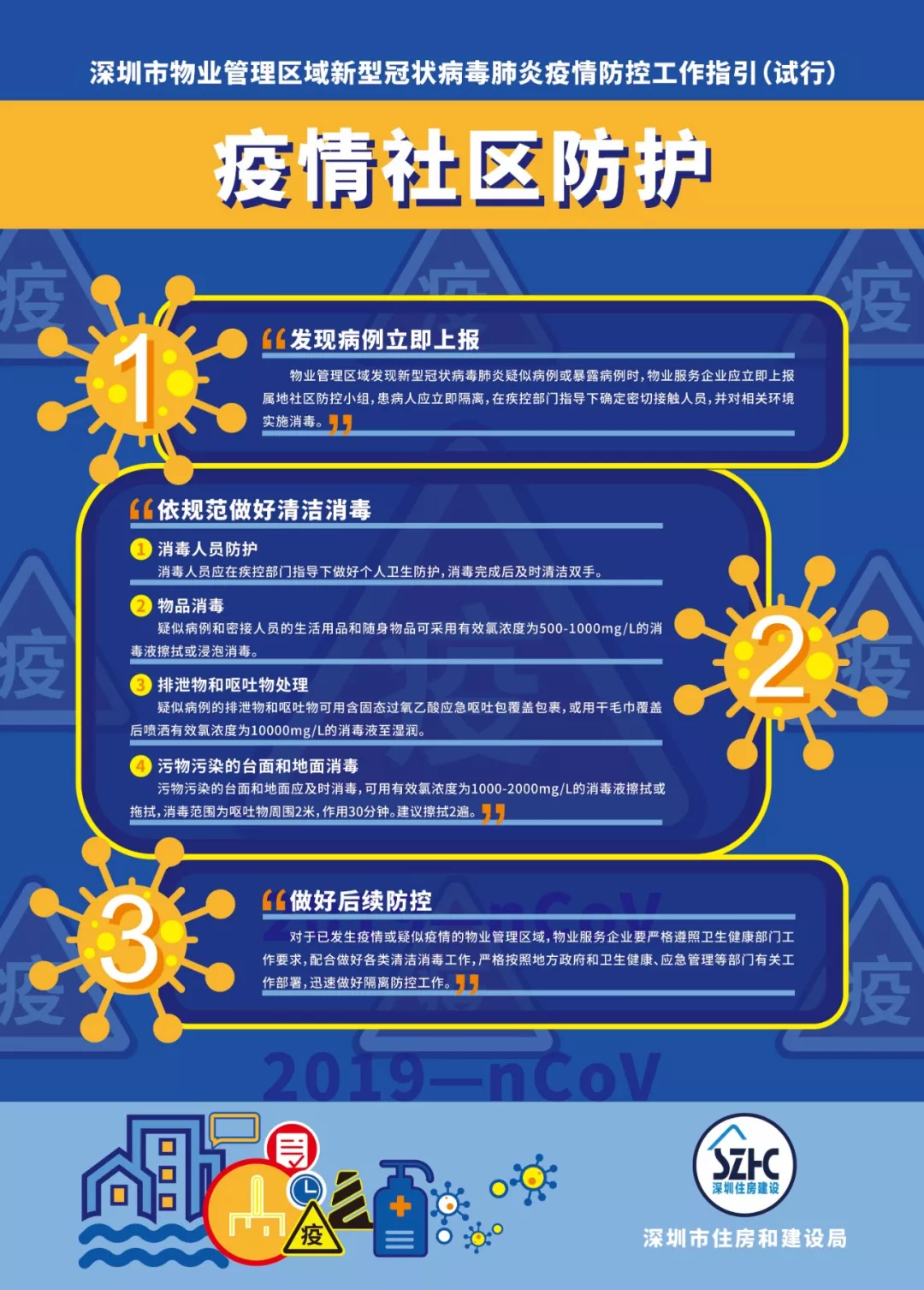 為進一步做好物業(yè)管理區(qū)域新型冠狀病毒肺炎疫情防控工作,依據(jù)《廣東省物業(yè)管理區(qū)域新型冠狀病毒感染的肺炎疫情防控工作指引(試行)》《深圳市新型冠狀病毒感染的肺炎疫情防控指揮部印發(fā)關(guān)于建立健全社區(qū)聯(lián)防聯(lián)控機制的若干措施的通知》《深圳市新型冠狀病毒感染的肺炎疫情防控指揮部辦公室社區(qū)小區(qū)組工作方案》《深圳市新型冠狀病毒感染的肺炎疫情防控指揮部辦公室關(guān)于印發(fā)住宅小區(qū)和城中村全面實施人員通行認(rèn)證管理的工作指引的通知》等文件,結(jié)合當(dāng)前實際,市住房建設(shè)局編制了《深圳市物業(yè)管理區(qū)域新型冠狀病毒肺炎疫情防控工作指引(試行)》,現(xiàn)印發(fā)給你們,請參照執(zhí)行。