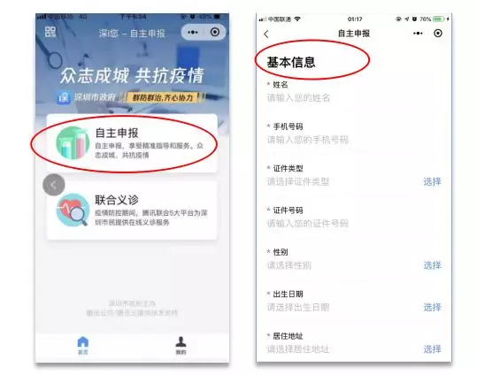 第一步:通過微信搜索“深i您-自主申報(bào)”小程序、i深圳公眾號-抗擊疫情-深i您自主申報(bào)、“i深圳”APP疫情防控服務(wù)專區(qū)入口等多途徑進(jìn)入自主申報(bào)平臺,請根據(jù)實(shí)際情況填寫基本信息、人員類型、是否居家隔離、居住屬性、是否有如下癥狀、其他等信息,其中帶*號和有必選字樣的為必填項(xiàng),請按照平臺提示填寫。