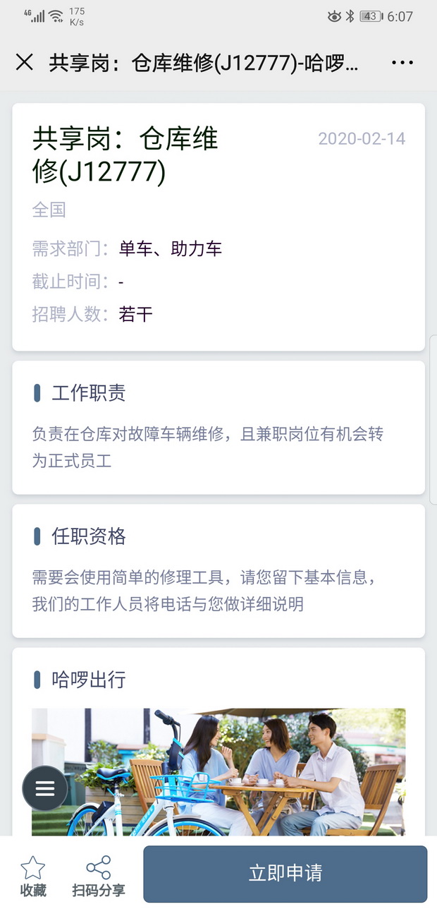 據(jù)了解,共享騎行的運(yùn)維工作有非常大的靈活性:一、根據(jù)崗位職能的不同,運(yùn)維每天的工作時間較靈活。如車輛調(diào)度人員,可以只在城市的上下班高峰期前后工作;二,工作形式上可以有比較大的靈活性。如哈啰的“單車獵人”,他的職能是在城市各個角落尋找因騎行超區(qū)失聯(lián)的單車、助力車;三,哈啰出行及哈啰的第三方人力公司,可以為這些崗位提供較為靈活的結(jié)薪方式,通過綠色通道可以做到按周或雙周結(jié)薪。待原崗用工恢復(fù),共享崗位員工可隨時返回。