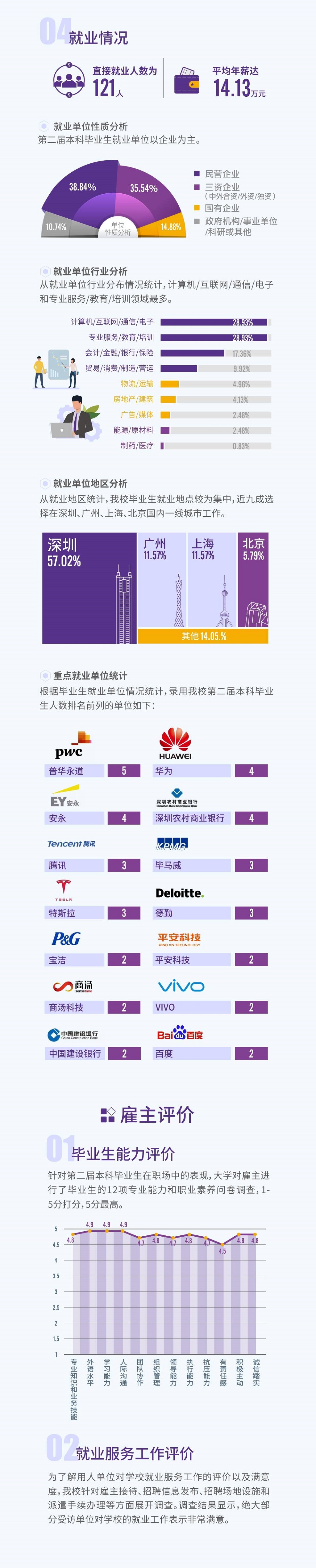 2019年,本科畢業(yè)生就業(yè)單位性質(zhì)更多元。除跨國(guó)公司、民營(yíng)企業(yè)外,更多學(xué)生被國(guó)有企業(yè)、事業(yè)單位青睞。數(shù)據(jù)顯示,第二屆本科畢業(yè)生的就業(yè)單位中,民營(yíng)企業(yè)占38.84%,如華為、百度;三資企業(yè)(中外合資/外資/獨(dú)資)占35.54%,如騰訊、寶潔、可口可樂、四大會(huì)計(jì)師事務(wù)所;國(guó)有企業(yè)占14.88%;另有10.74%畢業(yè)生受聘于政府機(jī)構(gòu)/事業(yè)單位/科研等機(jī)構(gòu)。