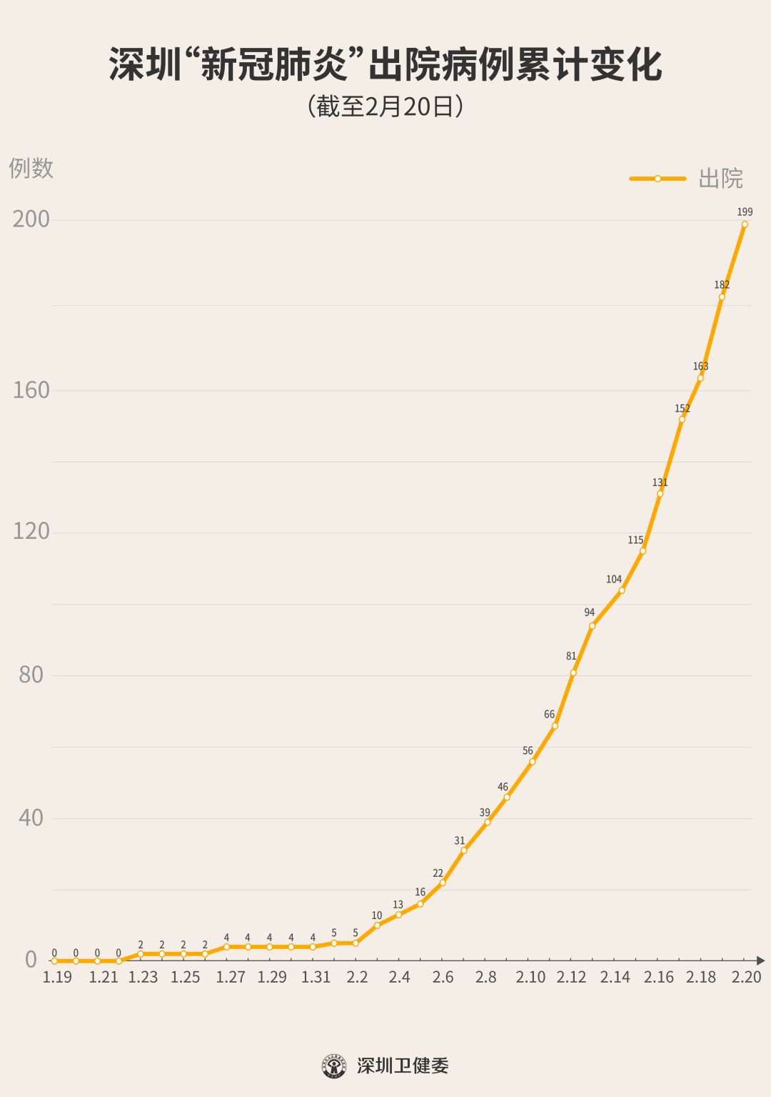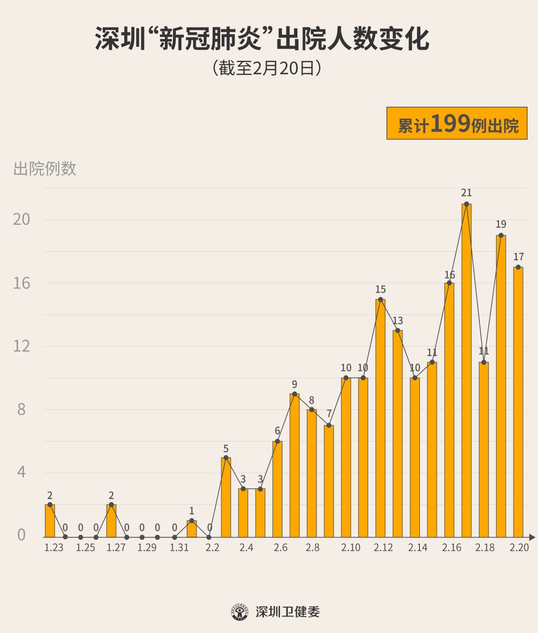 2月20日下午,經(jīng)專家組會(huì)診,深圳再有17名新型冠狀病毒肺炎確診患者出院,累計(jì)達(dá)199人,連續(xù)18天有人出院。