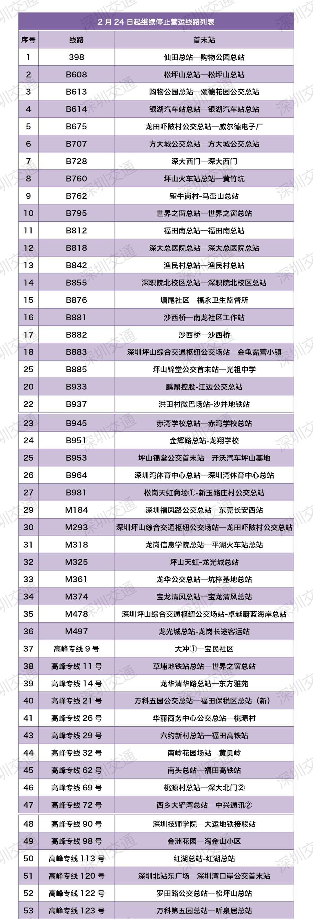 見圳客戶端·深圳新聞網(wǎng)2020年2月21日訊 據(jù)深圳交通微信公眾號消息,根據(jù)國家、省、市針對節(jié)后復(fù)產(chǎn)復(fù)工相關(guān)要求,結(jié)合目前新型冠狀病毒疫情防控需要及行業(yè)實(shí)際情況,經(jīng)研究↓2月24日起,深圳除以下114條公交線路外,其他公交線路恢復(fù)正常運(yùn)營: