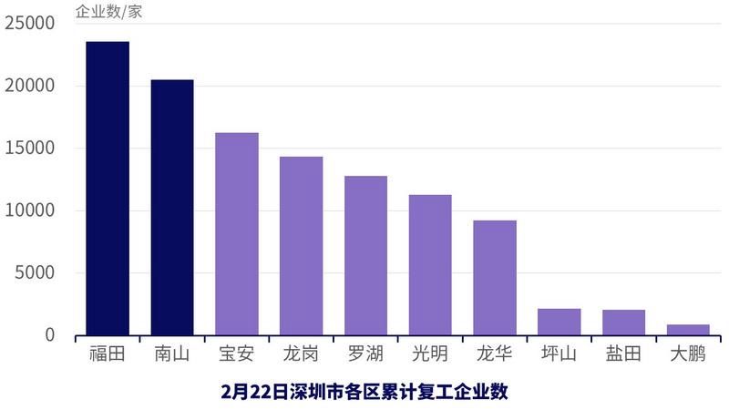 截至2月22日,全市累計(jì)復(fù)工企業(yè)已達(dá)11萬余家,其中,福田區(qū)、南山區(qū)已有超過2萬家企業(yè)復(fù)工,復(fù)工率在全國主要經(jīng)濟(jì)城市中名列前茅。