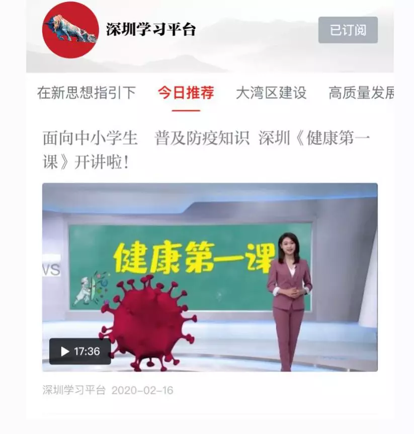 2月17日,“學(xué)習(xí)強(qiáng)國(guó)”深圳學(xué)習(xí)平臺(tái)編輯部和深圳市疾控中心聯(lián)合策劃推出的《健康第一課》節(jié)目在“學(xué)習(xí)強(qiáng)國(guó)”深圳學(xué)習(xí)平臺(tái)首發(fā),宣傳普及新型冠狀病毒肺炎防控知識(shí),助力做好學(xué)校疫情防控工作,廣大學(xué)生家長(zhǎng)積極收看,反響良好。