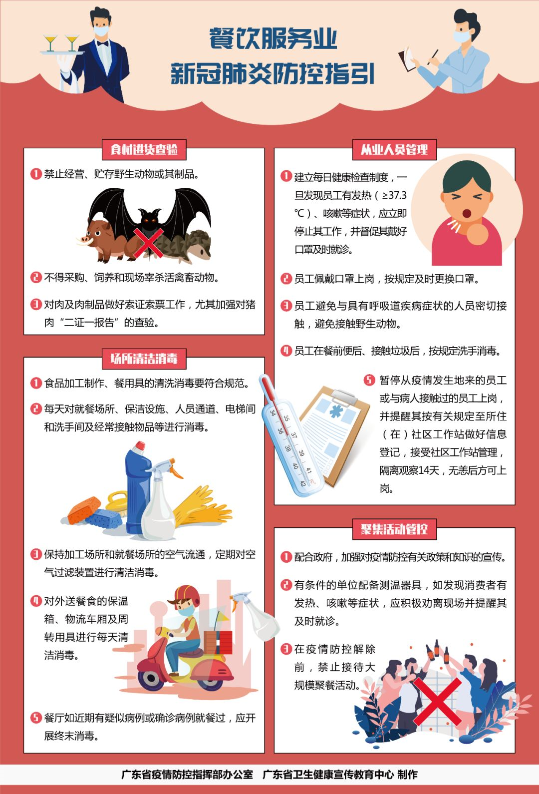 1、嚴(yán)格按照《機(jī)關(guān)、企業(yè)及工廠節(jié)后復(fù)工防控新型冠狀病毒肺炎工作指引》(粵衛(wèi)疾控函〔2020〕14號(hào))、《餐飲服務(wù)食品安全操作規(guī)范》要求以及國家衛(wèi)生健康委員會(huì)《新型冠狀病毒感染的肺炎防控方案》《新型冠狀病毒感染的肺炎公眾防護(hù)指南》等防控要求,建立健全防控制度,壓實(shí)防控責(zé)任,嚴(yán)格從業(yè)人員管理,杜絕從業(yè)人員帶病上崗。