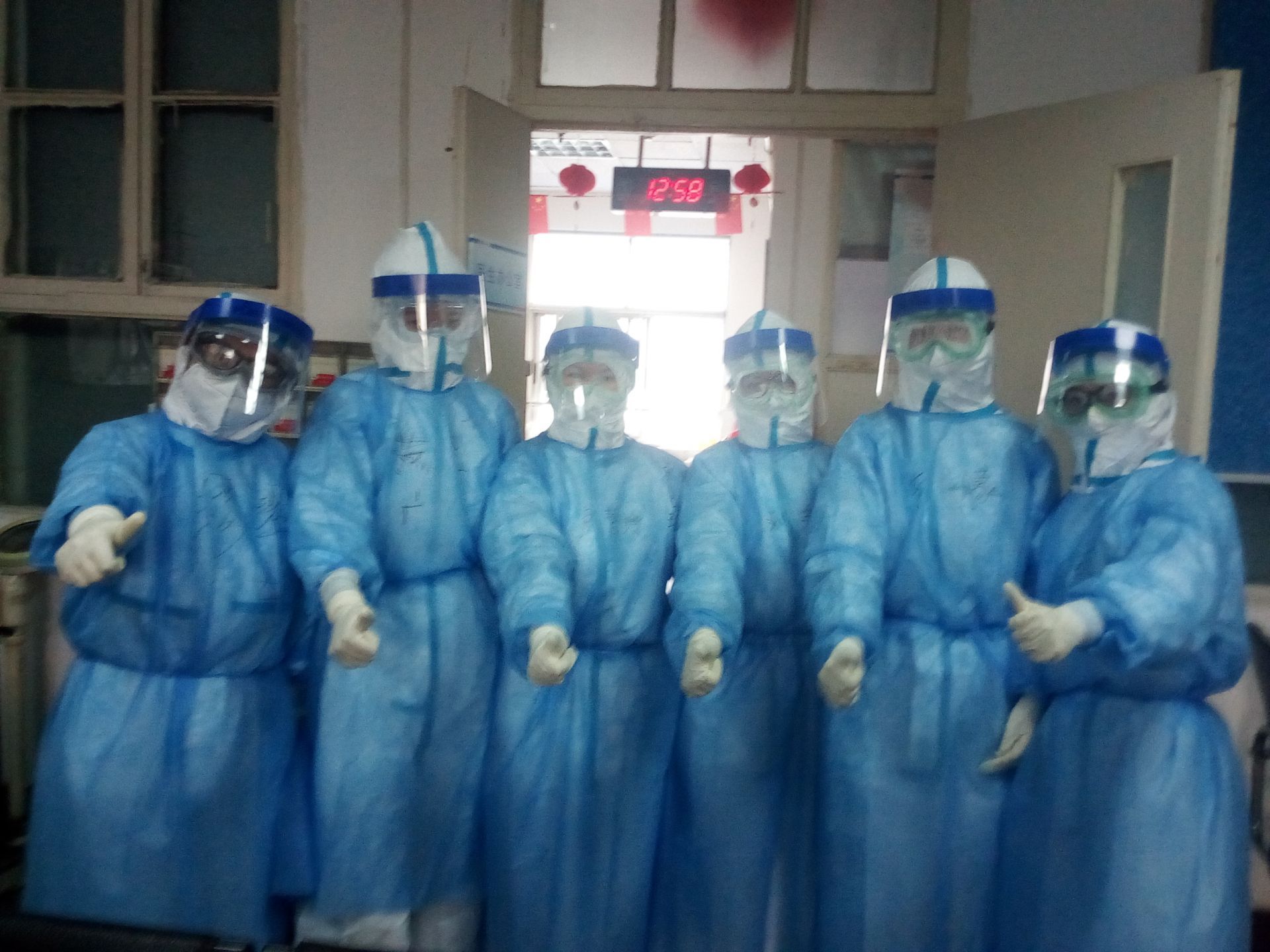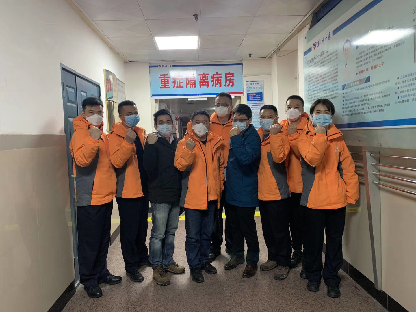醫(yī)生團(tuán)隊(duì)共有7個(gè)人,我也將他們送到重癥隔離病區(qū)門口。我不能進(jìn)去,就和大家一起合了個(gè)影,這是我這一輩子都不能忘記的一次合影,我們每個(gè)人豎拳的手勢(shì)都那么有力,每個(gè)人的眼神都那么堅(jiān)定!連最瘦弱的女醫(yī)生單雪也看起來(lái)充滿力量。