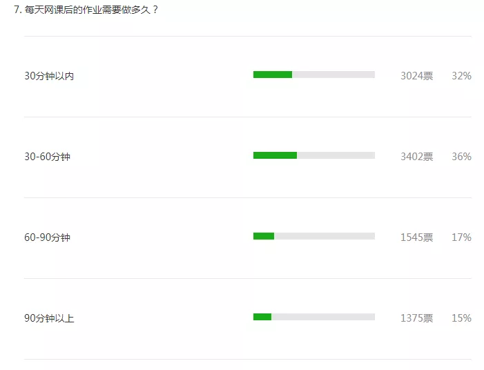 根據(jù)投票結(jié)果,68%的人認為網(wǎng)課后的作業(yè)在60分鐘內(nèi)可以完成。不過,許多參與者認為網(wǎng)課后的作業(yè)對于家長來說負擔較重。
