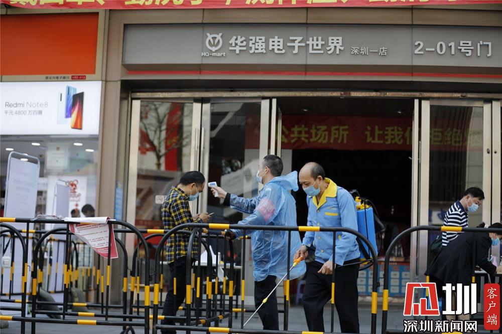 華強電子世界深圳一店入口,工作人員正在為入場者測量體溫。