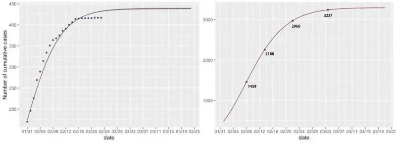 進(jìn)一步地?cái)M合深圳新冠肺炎的累計(jì)確診人數(shù),并對(duì)累計(jì)確診人數(shù)做出預(yù)測(cè)??梢钥吹?,模型預(yù)測(cè)自2月28日起病例數(shù)不再增加,預(yù)測(cè)得到最終的累計(jì)確診人數(shù)收斂在422人左右。