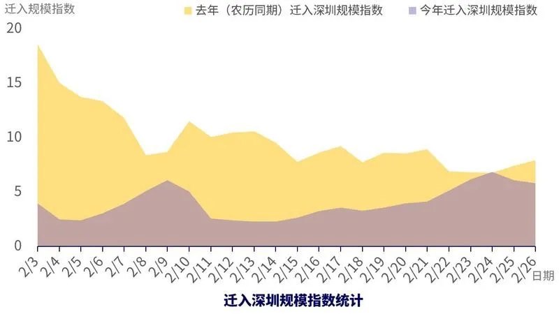 年前,深圳人口達(dá)2000萬(wàn)人,春節(jié)期間最低830多萬(wàn)人。從百度地圖遷徙-春運(yùn)期間遷入深圳趨勢(shì)可以看到,相比去年,年后遷入深圳規(guī)模較去年一直呈現(xiàn)平穩(wěn)的低態(tài)勢(shì),但在2月9日呈現(xiàn)出一波返程小高峰,2月14日,在深人數(shù)約1300萬(wàn)人,目前約1600萬(wàn)人,也就是說年后至今約有七百多萬(wàn)人從外地返回深圳。