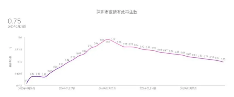 最后,考慮新冠肺炎的有效再生數(shù)。有效再生數(shù),即有效感染數(shù),指一個(gè)患病者平均可以感染健康者的人數(shù)。當(dāng)有效再生數(shù)下降到1以內(nèi)時(shí),可以認(rèn)為疫情就已經(jīng)得到了很好的控制并將逐漸消失。以全國(guó)第一例確診患者的報(bào)道時(shí)間為疫情開始時(shí)間,計(jì)算出深圳市疫情有效再生數(shù),可以看到有效再生數(shù)在經(jīng)過一段時(shí)間上升后,在2月3日附近出現(xiàn)拐點(diǎn),2月3日之后處于逐漸下降水平,2月23日已從峰值的1.05下降到了0.75,說明針對(duì)疫情的一系列防控措施取得了很好的效果。