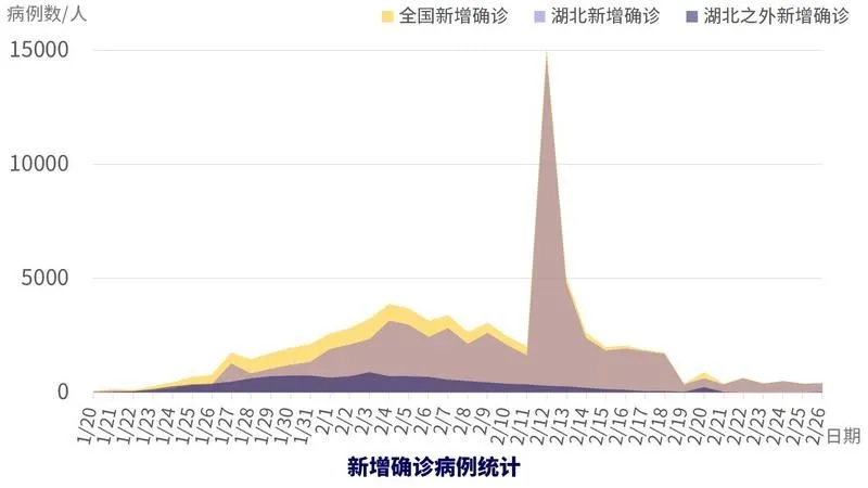 目前每日新增確診病例呈下降趨勢(shì)。2月3日,非湖北地區(qū)新增確診病例達(dá)到最高峰890例,之后逐漸下降(2月20日監(jiān)獄系統(tǒng)新增確診病例,造成數(shù)據(jù)波動(dòng)),2月26日新增確診病例降至24例,為最高峰的2.7%,前一天新增病例5例,僅為最高峰的0.56%。湖北地區(qū)新增確診病例在2月4日達(dá)到最高峰3156例(2月12日,2月13日,由于確診標(biāo)準(zhǔn)的改變,造成數(shù)據(jù)波動(dòng)),隨后基本呈下降趨勢(shì),2月26日新增確診409例,為最高峰的12.96%。