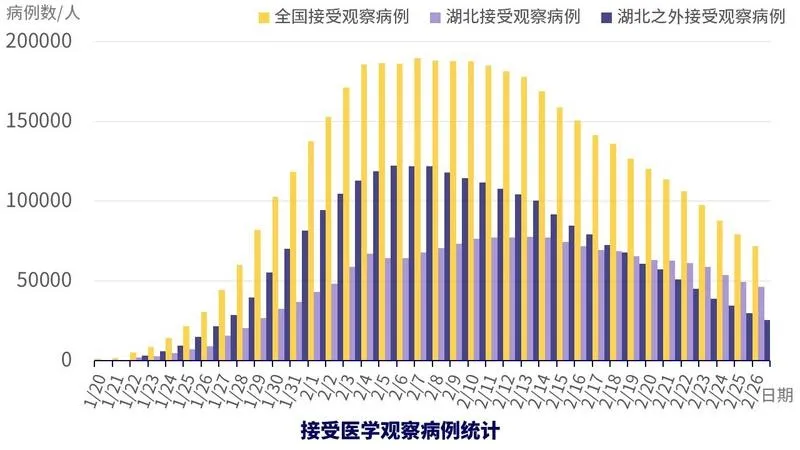 還值得關(guān)注的是正在接受醫(yī)學(xué)觀察的人數(shù),在全國(guó)嚴(yán)格管控的情況下,未來新增確診病例很大比例會(huì)來自這部分人群。從數(shù)據(jù)中可以看到,非湖北地區(qū)接受醫(yī)學(xué)觀察人數(shù)正在快速下降,湖北地區(qū)的也在穩(wěn)步下降中,這可能預(yù)示著未來新增確診病例也將下降。