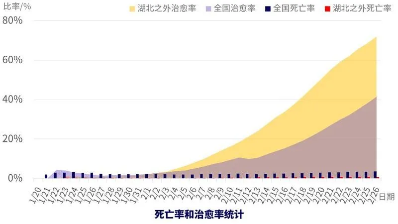 治愈率遠(yuǎn)超死亡率。截至2月26日,非湖北地區(qū)治愈率已達(dá)72%,死亡率為0.8%。全國(guó)治愈率也在不斷提升,與死亡率之間的距離快速拉大,2月26日,全國(guó)治愈率41.4%,死亡率3.5%。