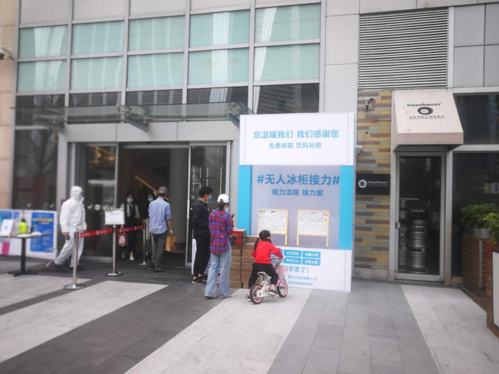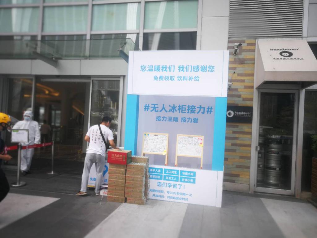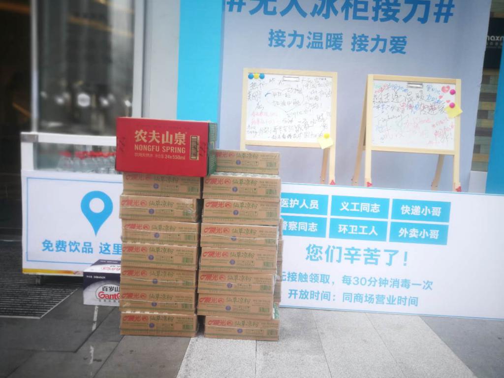 據(jù) COCO PARK工作人員介紹,無人冰柜是本周初由商場提供并擺放在東門口的,初衷就是讓上述這些群體能適當(dāng)補(bǔ)充體力并感受這座城市的溫暖。