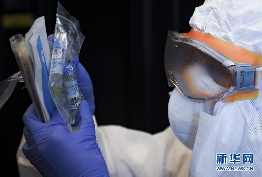 2月27日,在深圳龍崗的一家“健康驛站”,工作人員進行咽拭子采集前的準備。 新華社記者 毛思倩 攝