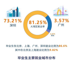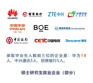 而在碩士研究生的就業(yè)數(shù)據(jù)方面,碩士研究生就業(yè)率達98.8%,四分之三的同學選擇了簽約就業(yè)。錄取畢業(yè)生最多的企業(yè)分別是華為、中興、招商銀行,大多數(shù)畢業(yè)生都留在了粵港澳大灣區(qū)。