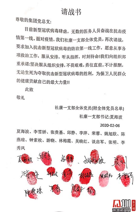 見圳客戶端·深圳新聞網(wǎng)訊(記者 董非)“讓黨旗在防控斗爭第一線高高飄揚?!毙鹿诜窝滓咔榘l(fā)生以來,南山區(qū)醫(yī)療集團總部黨員勇當(dāng)先鋒,以實際行動踐行初心使命,涌現(xiàn)出眾多感人故事,展現(xiàn)了共產(chǎn)黨員的風(fēng)采與擔(dān)當(dāng)。 疫情發(fā)生后,南山區(qū)第一時間制定出臺了《黨建引領(lǐng)疫情防控工作五項行動方案》,南山區(qū)委書記王強號召全體黨員,發(fā)揮黨組織的戰(zhàn)斗堡壘作用和黨員的先鋒模范作用,全力保障人民群眾生命安全和身體健康,讓黨旗在防控疫情斗爭第一線高高飄揚,堅決打贏疫情防控人民戰(zhàn)爭、總體戰(zhàn)、阻擊戰(zhàn)。南山區(qū)醫(yī)療集團總部積極響應(yīng),黨建引領(lǐng)下的防控抗疫工作有序科學(xué)地展開。 今年1月底,深圳市南山區(qū)區(qū)委授旗成立南山醫(yī)療系統(tǒng)黨員突擊隊。南山區(qū)醫(yī)療集團總部緊急組建了防控新冠肺炎應(yīng)急突擊隊,僅一天內(nèi)區(qū)醫(yī)療集團就共有169人完成第一批應(yīng)急突擊隊報名,其中黨員過半數(shù)。 疾風(fēng)知勁草,烈火煉真金。一封封請戰(zhàn)書閃電匯聚到黨總支,召即來,來能戰(zhàn),戰(zhàn)能勝,沖鋒在前就是擔(dān)當(dāng)?shù)淖蠲姥堇[;一位位黨員迅速入隊黨員突擊隊,他們重溫入黨誓言,在黨旗下實踐著醫(yī)者仁心、人間大愛;一份份入黨申請書紛沓而來,特殊時期經(jīng)受特殊考驗,一批優(yōu)秀的醫(yī)護人員頁主動向黨組織靠攏。鏗鏘的語言、堅定的決心、舍我的擔(dān)當(dāng),是南山區(qū)醫(yī)療集團總部廣大黨員逆行而上、抗擊疫情的堅定決心和必勝信心。 最美逆行黨支部,積極請戰(zhàn)敢擔(dān)當(dāng) “我是共產(chǎn)黨員,我請戰(zhàn)!愿為戰(zhàn)勝疫情全力以赴!”這是南山區(qū)醫(yī)療集團總部一支部13名黨員和2名入黨積極分子聯(lián)名撰寫的《請戰(zhàn)書》(節(jié)選)。 面對新冠肺炎疫情,一支部黨員在夏海波支部書記夏海波的帶領(lǐng)下,在發(fā)熱門診、發(fā)熱患者預(yù)檢分診、社區(qū)“三位一體”排查等工作中,積極發(fā)揮共產(chǎn)黨員戰(zhàn)斗在一線、沖鋒在一線的模范帶頭作用,為戰(zhàn)勝新冠肺炎疫情全體黨員積極主動請戰(zhàn),并向集團黨總支遞交了請戰(zhàn)書。 社康一支部全體黨員的請戰(zhàn)書 一個個紅手印,令人淚目,彰顯著南山區(qū)醫(yī)療集團總部白衣天使們逆行而上的使命擔(dān)當(dāng)和責(zé)任意識。 一支部書記夏海波說,“成為疫情防控工作第一線發(fā)展黨員,是面對疫情充分發(fā)揮黨員先鋒作用的具體實踐。此次請戰(zhàn),將更加激勵他們我們在今后的工作特別是近期防疫防控工作中,以黨員的標(biāo)準(zhǔn)嚴格要求自己,發(fā)揮黨員先鋒模范作用。同時,也會對全院全體員工產(chǎn)生積極引領(lǐng)、鼓舞作用,以更飽滿的斗志投入防疫防控工作。” 老黨員重溫入黨誓詞,面對黨旗表決心 “我宣誓:我志愿加入中國共產(chǎn)黨……”這是一次特別的宣誓。接到組織號召后,社康二支部的老黨員鐘達宏和吳麗娉,對著黨旗,以重溫入黨誓詞的方式,不忘黨員初心,牢記使命,積極沖鋒在前,誓要打贏防控狙擊戰(zhàn)。 社康二支部的老黨員鐘達宏和吳麗娉,對著黨旗,重溫入黨誓詞,誓要打贏防控狙擊戰(zhàn) 面對來勢洶洶的疫情,南山區(qū)醫(yī)療集團總部的黨組織和黨員干部不但沒有被嚇倒,反而激起了他們昂揚的戰(zhàn)斗意志和飽滿的工作熱情。 “我宣誓,我自愿加入抗擊新型冠狀病毒肺炎疫情防控工作隊伍,責(zé)任上肩,聽黨指揮,服從命令,科學(xué)應(yīng)對,恪盡職守,努力守護轄區(qū)居民健康,堅決打贏疫情防控攻堅戰(zhàn)!”守土有責(zé)、守土擔(dān)責(zé)、守土盡責(zé),所有社康中心的黨員干部將筑牢抗疫的基層防線,誓要守護轄區(qū)居民的生命健康。 社康二支部黨員在黨旗下宣誓努力守護轄區(qū)居民健康 艱難時刻主動請戰(zhàn),夫妻雙雙奮戰(zhàn)一線 1月26日,南山區(qū)醫(yī)療集團總部下發(fā)關(guān)于組建防控新型冠狀病毒感染肺炎應(yīng)急突擊隊報名的通知。除了得到集團黨員們的積極響應(yīng)之外,各個支部涌現(xiàn)出一波遞交入黨申請書的小高潮。 李婧是社康支部的一名全科醫(yī)生,一直在社康醫(yī)院中心從事全科醫(yī)療工作,戰(zhàn)“疫”的號角吹響,李婧第一時間參戰(zhàn),在所有抗疫時期入黨人員里第一個遞交了手寫入黨申請書。 李婧醫(yī)生的手寫入黨申請書 起初,她所在的蔚藍海岸社康中心考慮到李婧的愛人是深圳市公立醫(yī)院急診科醫(yī)生其愛人是深圳市某公立醫(yī)院的急診科醫(yī)生,疫情發(fā)生以來一直堅守在崗位上,家中尚有1歲零3個月的寶寶,就沒有讓她參加社區(qū)“三位一體”排查和酒店留守值班等一線工作和醫(yī)學(xué)觀察點留守值班等一線工作。李婧得知后,她主動提交請戰(zhàn)書、舍小家顧大家,并沒有因為生活上的困難而有所退縮,主動要求參與疫情排查一線工作。李婧夫妻還制定了家庭的“交接班”制度,一個去上白班,另一個就上夜班。 執(zhí)行三位一體排查工作前,李婧醫(yī)生與民警、社區(qū)工作者開會準(zhǔn)備 在南山醫(yī)療集團第六黨支部書記蔡偉山給她的入黨介紹信中這樣寫道:李婧和她的愛人都雙雙忙