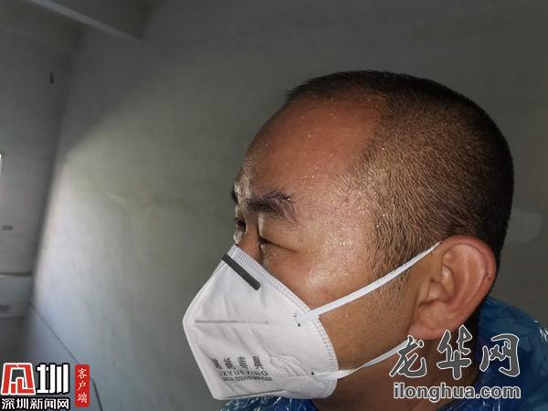 接到有返深人員的通知,他立刻帶隊趕往現(xiàn)場,多次測溫后仍體溫偏高,他不放心地叫來三位一體人員,一番確認(rèn)之后,將發(fā)熱人員送往醫(yī)院,他則獨自善后對樓道進(jìn)行消毒,將近兩個小時的折騰,他終于得以到垃圾桶旁邊喘口氣。額頭勒出的印痕和黏在后背的制服,都是每一天的勛章。