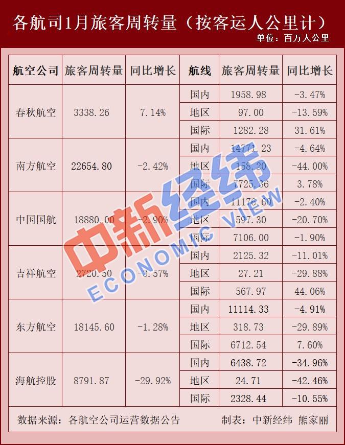 統(tǒng)計發(fā)現(xiàn),春秋航空、南方航空、吉祥航空等6家航空公司已公布2020年1月運營數(shù)據(jù)。從旅客周轉(zhuǎn)量 (按客運人公里計 )來看,與去年同期相比,1月僅春秋航空一家上漲,增7.14%,其余5家均同比下降。