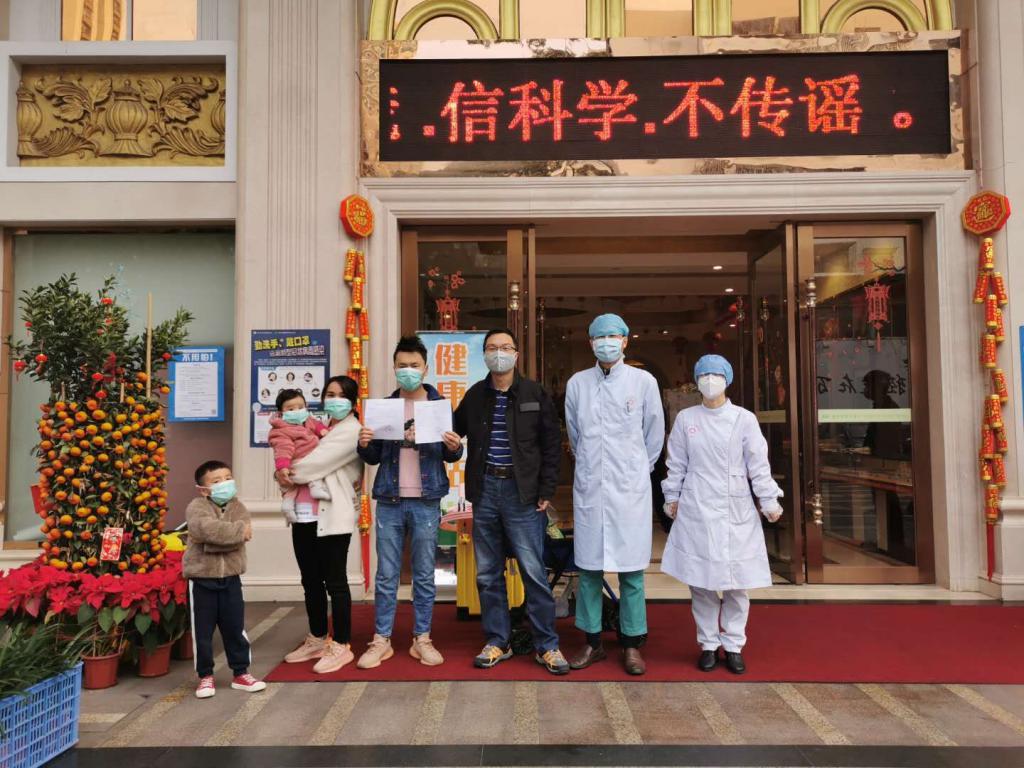 ▲2月10日,健康驛站第一家醫(yī)學(xué)觀察家庭離站時的合影。呂志軍供圖