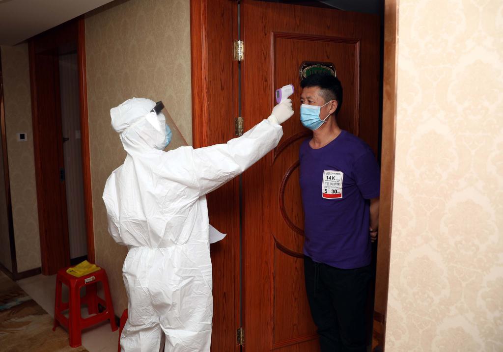 ▲醫(yī)護(hù)人員給南園街道健康驛站的臨時醫(yī)學(xué)觀察人員測量體溫。楊少昆攝