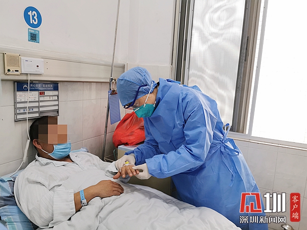 剛剛看到檢測結(jié)果,鄺醫(yī)生便迅速穿上防護服,進入隔離區(qū)跟患者進行了面對面的溝通交流。那位患者得知自己檢測的結(jié)果后略顯失落,嘆了一口氣,似乎是擔心焦慮等待了多日,心里的石頭終于落了地。他說:“我一定聽您的話,好好吃藥,好好治療,爭取活著回來。”