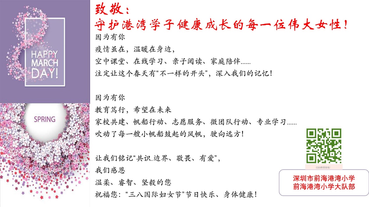 前海港灣小學(xué)希望這份特殊的“女神禮物”,讓我們?cè)诮衲赀@個(gè)不一樣的“三八國(guó)際婦女節(jié)”的日子里感到不會(huì)一樣的溫暖。