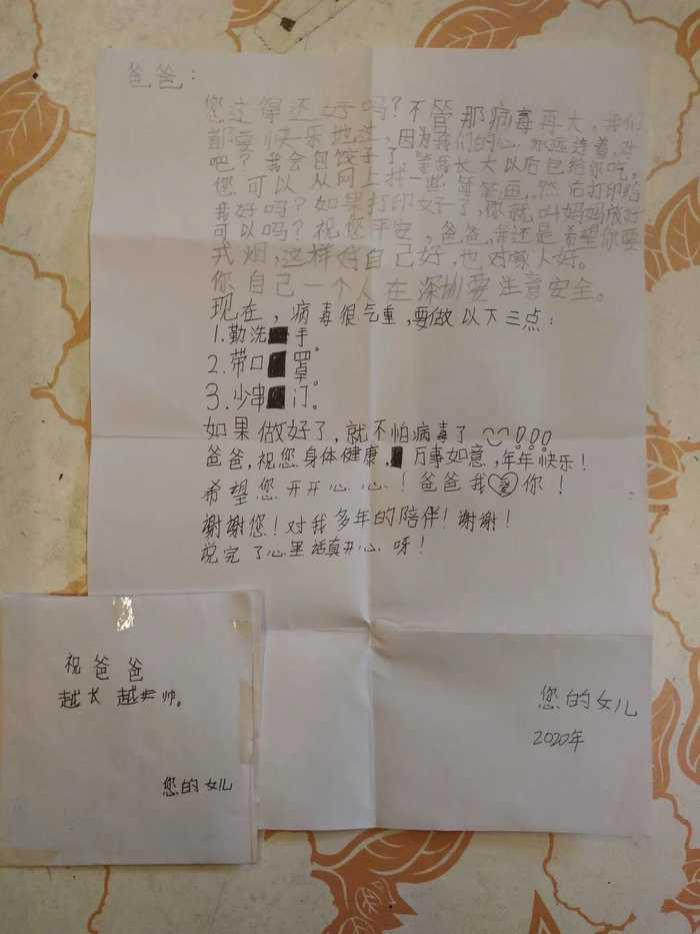 深圳晚報2020年3月9日訊 "爸爸:您過得還好嗎?不管那病毒再大,我們都要快樂地過,因為我們心連在一起……"日前,白云飛收到一封9歲女兒白家茵在高州老家給他郵寄的信件。看著女兒發(fā)來的一行行文字,白云飛動容地說道,"原本答應(yīng)她過年帶她去沙灘,聽到我說要提前回深圳與病毒作斗爭,還叮囑我一人在外注意安全。"紙短情長,他感覺自己的女兒長大了,他為女兒的堅強懂事而感動和自豪。"由于工作原因,爸爸需要提前回到工作崗位。等疫情過后,爸爸也抽時間好好陪你一下哈……"白云飛字里行間寫下了對女兒的愧疚之情。