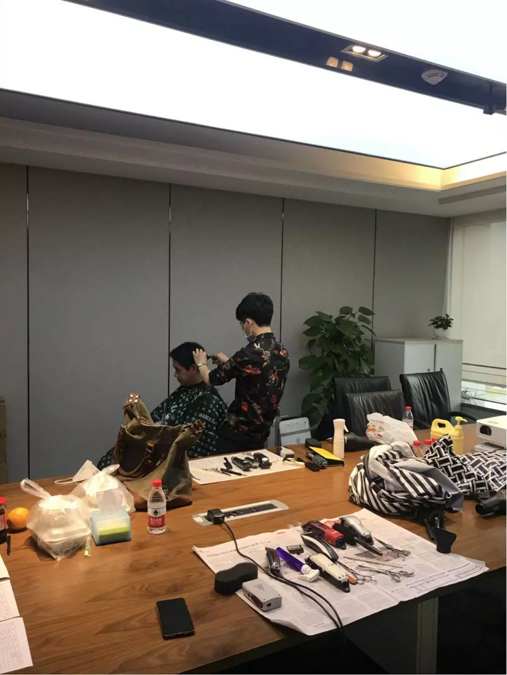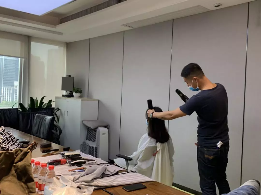 公司本部,1303會議室,臨時理發(fā)室“生意”也火爆極了。公司工會邀請了兩名專業(yè)的Tony老師,為近90名員工提供免費(fèi)的理發(fā)服務(wù)。為減少人員聚集,理發(fā)采取提前線上預(yù)約,分時段進(jìn)行,確保安全的同時,盡可能讓有需要的同事都能理上發(fā)。鋪上一次性地毯,坐上椅子,圍上一次性“斗篷”,Tony老師一頓熟練的剪發(fā)操作后,再用吹風(fēng)機(jī)整好造型,就完成了理發(fā)的全過程。臨時理發(fā)師的搭建,有效解決了員工生活上的困難,幫助他們以良好的精神面貌投入工作來。