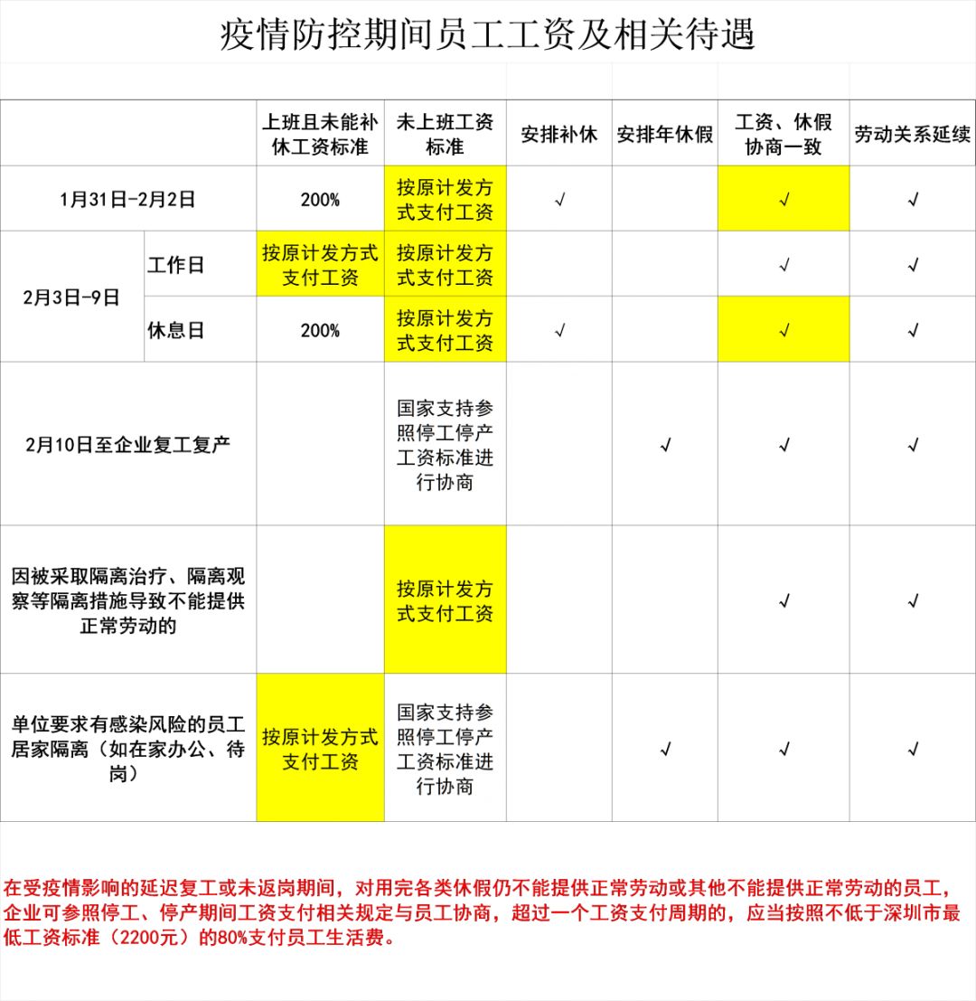 在2月3日至9日(廣東省延遲復(fù)工期間),未復(fù)工的,企業(yè)按照勞動合同約定的標(biāo)準(zhǔn)支付工資;安排職工工作的,應(yīng)當(dāng)依法支付工資。其中,企業(yè)在休息日安排工作又不能安排補(bǔ)休的,按照不低于職工本人日或小時(shí)工資標(biāo)準(zhǔn)的200%支付工資。