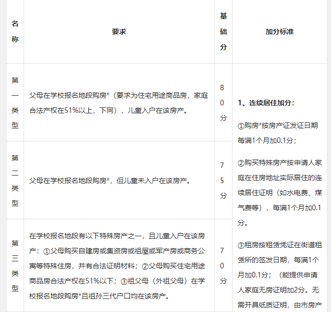租房:父母、祖父母、外祖父母或法定監(jiān)護(hù)人在申請(qǐng)學(xué)校學(xué)區(qū)內(nèi)租房且能提供《房屋租賃憑證》或《公共租賃房合同》,按簽發(fā)日期每滿一個(gè)月加0.1分,其他類(lèi)住房不積分。
