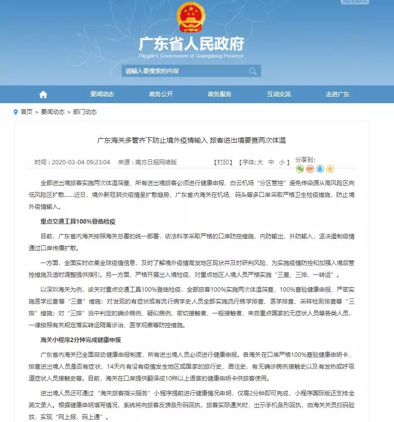 廣東省內(nèi)海關已全面啟動健康申報制度,所有進出境人員必須進行健康申報。