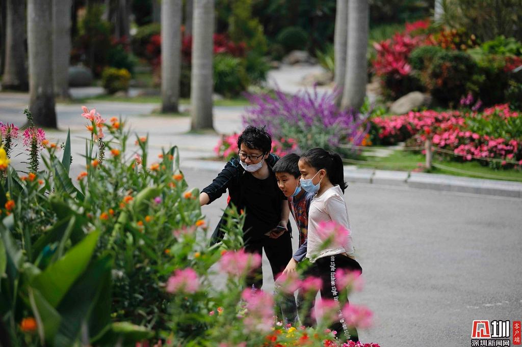 蓮花山公園一角,鮮花盛開,一位家長(zhǎng)正為她的孩子拍照。