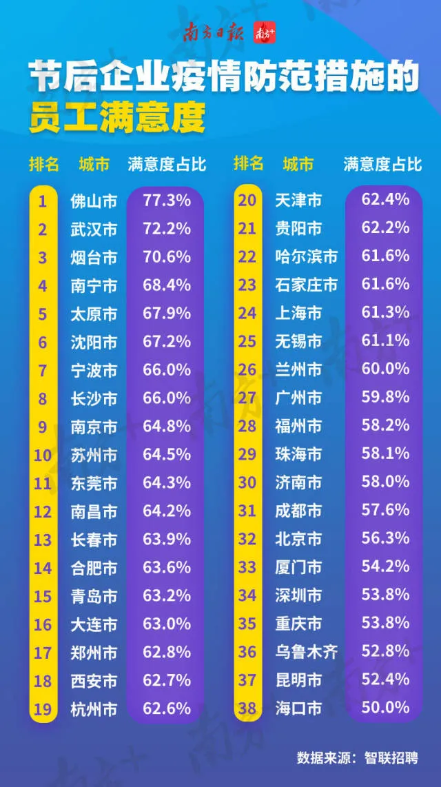 從上述《報告》中可以看出,佛山市企業(yè)的員工滿意度是全國最高的,高達(dá)77.3%,與全城“停擺”的武漢、山東煙臺齊齊超過七成滿意度。