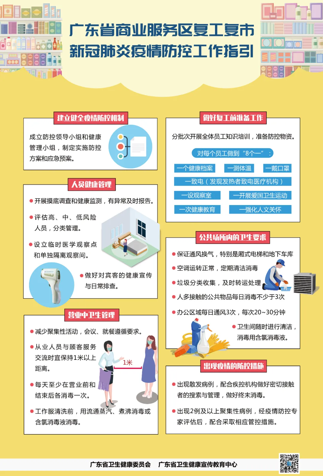 (1)制定相關(guān)工作措施。包括但不限于復(fù)市后市場(chǎng)進(jìn)出口管理、現(xiàn)場(chǎng)管理、健康管理、衛(wèi)生管理、應(yīng)急預(yù)案管理、防疫培訓(xùn)等工作方案或工作指引。