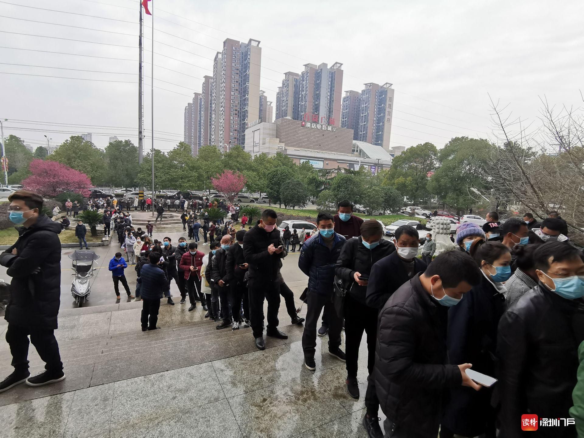 2月23日,監(jiān)利縣交通局門前排隊(duì)申請(qǐng)返回工作地的當(dāng)?shù)厝罕?。不久,湖北再次升?jí)封控措施,直到近日才逐漸恢復(fù)正常交通。