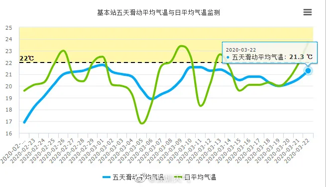 以5天滑動(dòng)平均氣溫穩(wěn)定>22 ℃ 為春季結(jié)束、夏季開始,看圖一中的藍(lán)色曲線(五天滑動(dòng)平均氣溫)已經(jīng)在抬頭了,能不突破虛線還得看接下來幾天的氣溫。