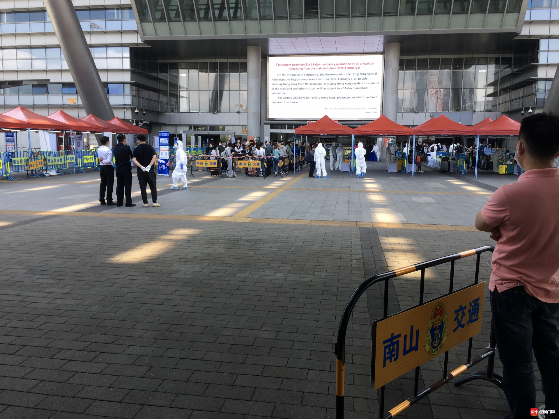 “排隊(duì)排了好幾個(gè)小時(shí),終于出來(lái)了!”頭戴帽子、護(hù)目鏡和口罩,外加一襲透明“雨衣”的趙女士把自己包裹得嚴(yán)嚴(yán)實(shí)實(shí),走到深圳灣口岸北廣場(chǎng)外才把帽子摘了,額頭微微出汗。她告訴記者,上午10點(diǎn)鐘她從香港出境,直到下午2點(diǎn)才通關(guān)。香港居民鐘先生是一名大學(xué)生,因老家有事才入境,他比趙女士要幸運(yùn)一些,從11點(diǎn)開(kāi)始通關(guān)的他花了2個(gè)多小時(shí)。