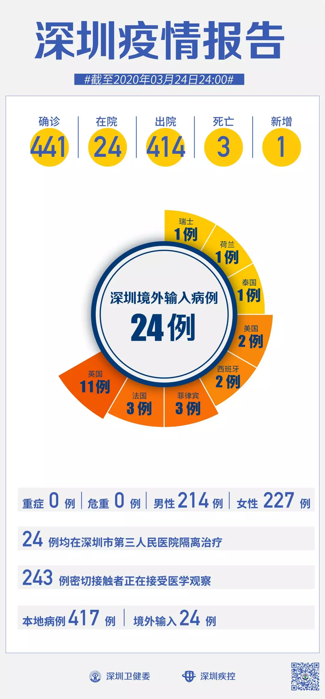 3月24日,深圳確診1例境外輸入“新冠肺炎”新病例,累計(jì)達(dá)24例。 病例24 男,31歲,巴西籍,在深圳工作,由英國返回。3月21日從英國倫敦乘坐SQ305航班飛往新加坡,22日從新加坡乘坐CZ3040航班飛往中國廣州,當(dāng)晚經(jīng)廣州白云機(jī)場入境,入境體溫36.6℃。23日凌晨由專車送往深圳集中隔離觀察,24日新冠病毒核酸初篩陽性,當(dāng)天深圳市疾控中心復(fù)核亦為陽性。 目前患者已被轉(zhuǎn)到深圳市第三人民醫(yī)院隔離治療。經(jīng)初步判定,在中國內(nèi)地有32名密切接觸者,已集中隔離。 截至3月24日24時(shí),深圳累計(jì)報(bào)告“新冠肺炎”病例441例。3月24日當(dāng)天新增1例。 累計(jì)報(bào)告確診病例中,男性214例、女性227例。 目前,死亡3例,累計(jì)出院414例。 24例確診病例均在深圳市第三人民醫(yī)院隔離治療。 243名密切接觸者正在接受醫(yī)學(xué)觀察。 資料來源:深圳市疾控中心、深圳市衛(wèi)健委、廣東省衛(wèi)健委