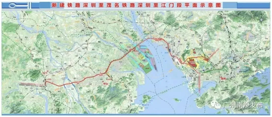 中段經(jīng)由南沙、中山,溝通珠澳,西至江門(mén)樞紐,西端在江門(mén)樞紐組合銜接多條高鐵,輻射粵西海南及西南廣大片區(qū)。