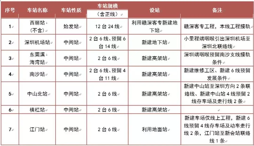西麗至南沙段200km全線設(shè)西麗、深圳機(jī)場(chǎng)、東莞濱海灣、南沙、中山北、橫欄、江門(mén)等7座車(chē)站。