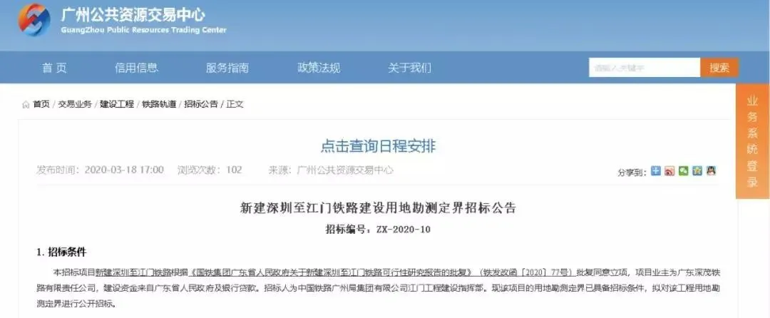 3月18日,《新建深圳至江門(mén)鐵路建設(shè)用地勘測(cè)定界招標(biāo)公告》在廣州公共資源交易中心網(wǎng)站正式發(fā)布。